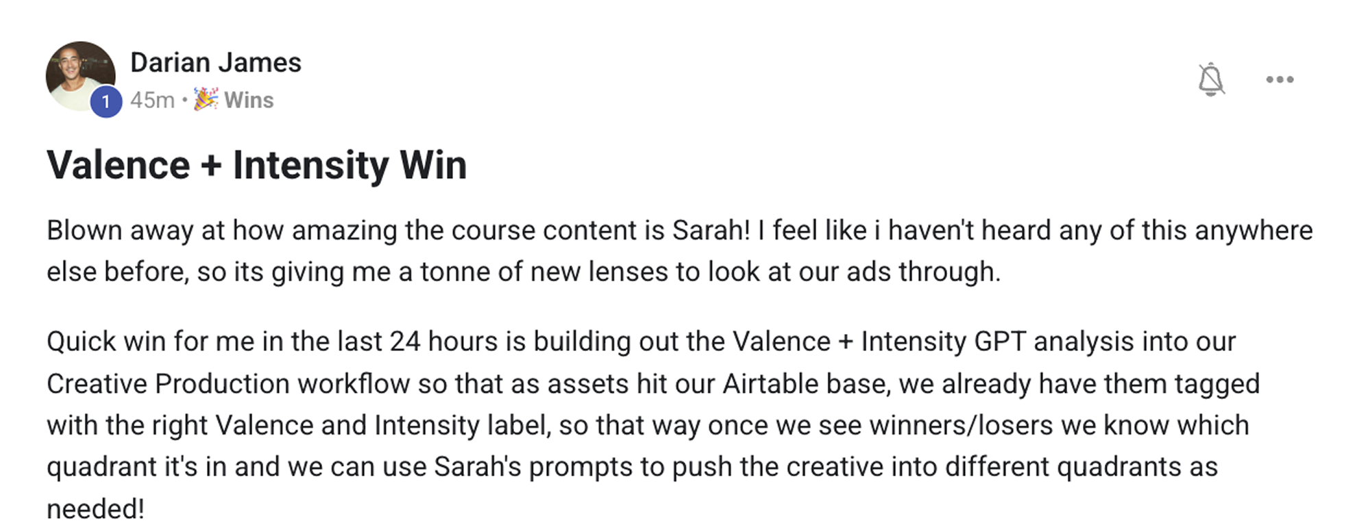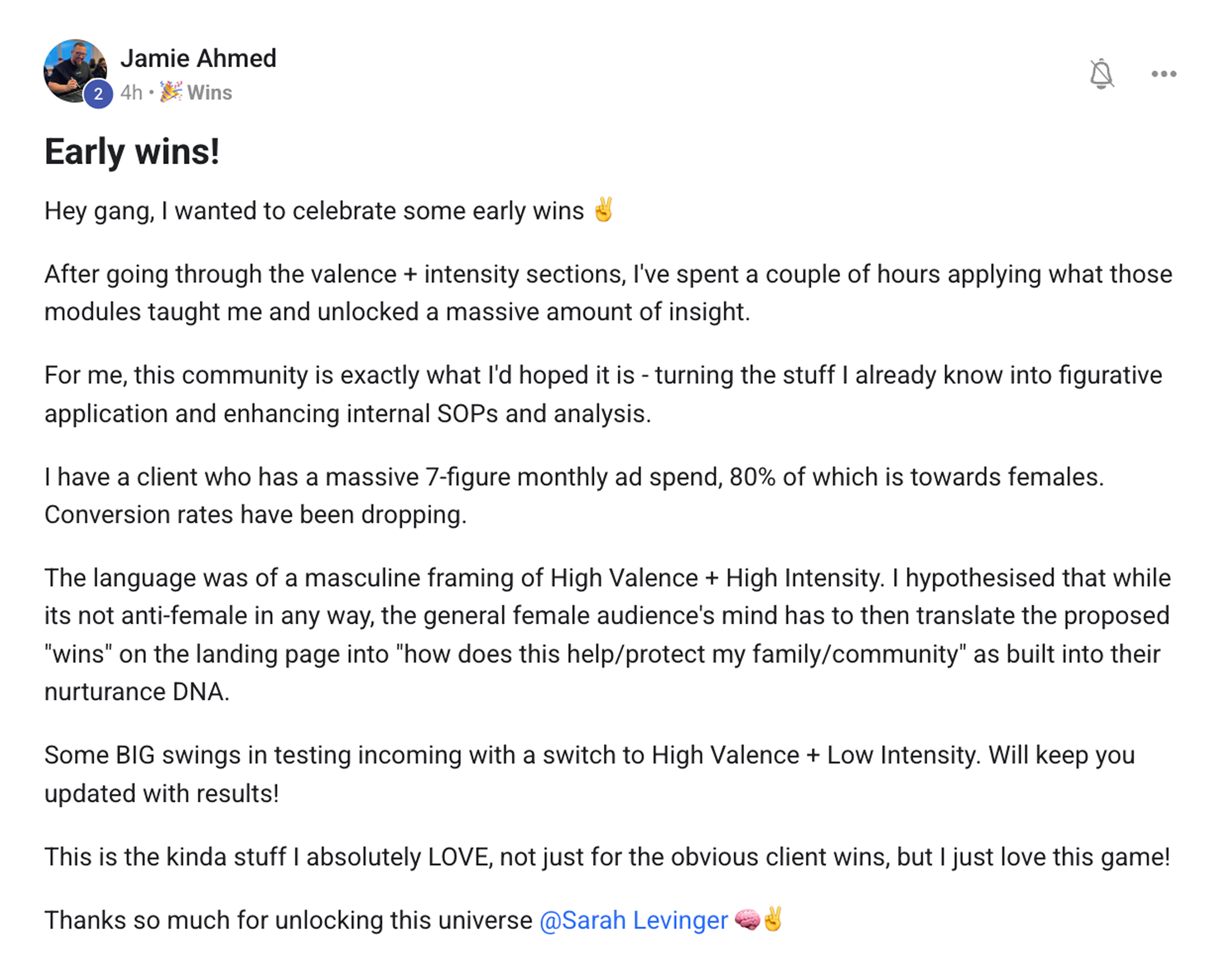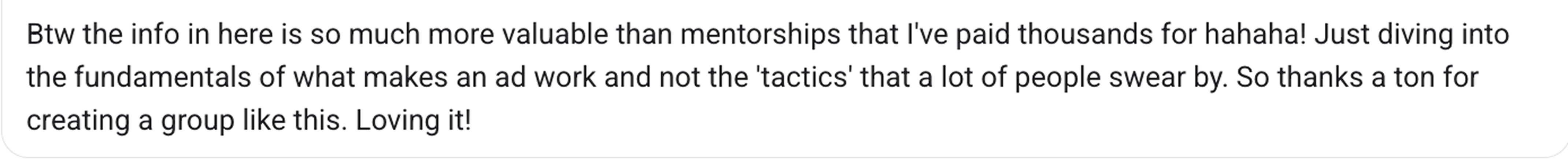 “Blown away at how amazing the course content is Sarah! I feel like I haven’t heard any of this anywhere else before, so it’s giving me a tonne of new lenses to look at our ads through.”
