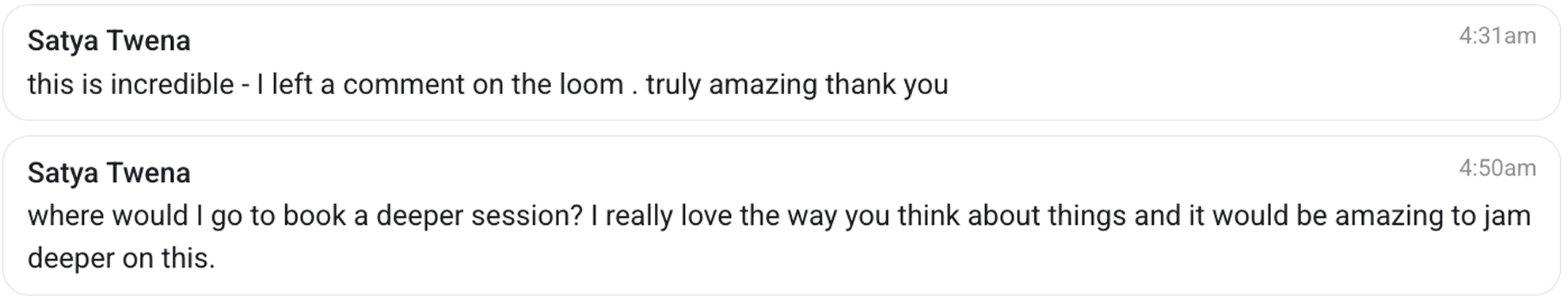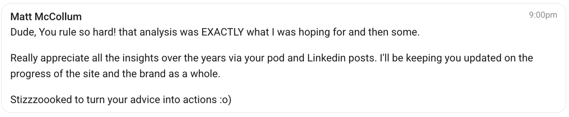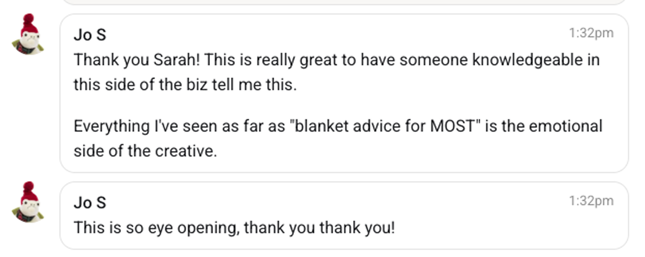 “The way you teach is fast, clear, and direct. It’s such a breath of fresh air. I’m usually bored by this kind of stuff, but everything you’ve shared feels relevant and has reignited my excitement to work on our product, the Cocoon.”